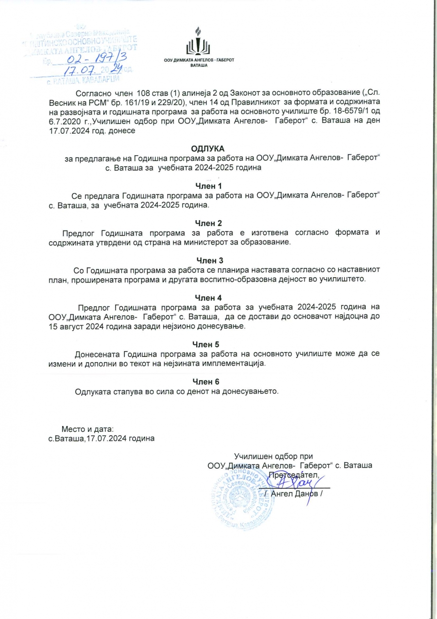 одлука за предлагањеOOУ„ДИМКАТА АНГЕЛОВ ГАБЕРОТ“с. ВАТАШАЗа учебната 2024/2025 година